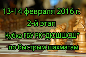 В период с 13 по 14 февраля 2016 года на базе ГБУ РК «ДЮШШСШ» по адресу: г.Симферополь ул.Гаспринского, 29 состоится 2-й этап Кубка ГБУ РК «ДЮШШСШ» по быстрым шахматам. К участию допускаються учащиеся ГБУ РК «ДЮШШСШ» не имеющие разряды , имеющие юношеские и третьи разряды. Регистрация состоится 13.02.2016 г. до 10.00